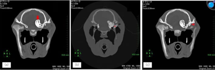a: Ectopic tooth located within the skull (red arrow). b: Ectopic tooth root located near the inner ear (arrowhead). c: A free, bone-like structure (arrowhead) was observed on the ventral side of the temporal bone.