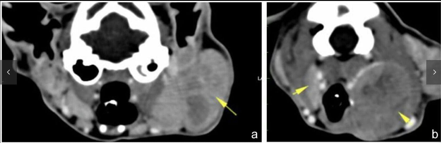 CT findings of a domestic shorthair cat aged 10 years 8 months (case 1) diagnosed with steroid-responsive neutrophilic lymphadenitis: (a) left parotid lymphadenomegaly (yellow arrow) (3.9 × 2 cm); and (b) left medial retropharyngeal lymphadenomegaly (2.5 cm) with heterogeneous contrast uptake and right medial retropharyngeal lymph node (0.5 cm thickness) (yellow arrows)