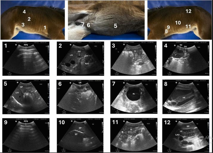 The 12-window FUS protocol. Probe placement site (top) and corresponding ultrasound image in a healthy foal (bottom) for the 12 acoustic windows of the FUS protocol. Four windows on the right side: 1. Right cranio-ventral thoracic window - Pleuropulmonary surface (PPS); 2. Hepato-duodeno-colic window - Liver (LI), right dorsal colon (RDC) and duodenum (DU); 3. Ventro-lateral abdomen window - Small intestine (SI) and large intestine (LI); 4. Nephro-cecum-duodenal window - Cranial pole of the right kidney (RK), cecum (CE) and duodenum (DU). Three windows on the ventral abdomen: 5. Retro-sternal window - Liver (LI), spleen (SP) and stomach (ST); 6. Meso-gastric window - Umbilical remnants (UR), small intestine (SI) and large intestine (LI). 7. Hypo-gastric window - Bladder (BL), small intestine (SI) and large intestine (LI). Five windows on the left side: 8. Cardiac window - Heart (HE); 9. Left cranio-ventral thoracic window - Pleuropulmonary surface (PPS); 10. Spleno-gastric window - Spleen (SP) and stomach (ST); 11. Ventro-lateral abdomen window - Small intestine (SI) and large intestine (LI); 12. Nephro-splenic window - Spleen (SP), left kidney (LK), left dorsal colon (LDC) and left adrenal gland (LAG).