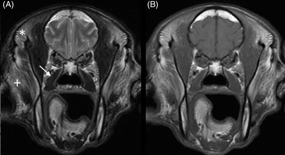 Transverse T2W (A) and T1W (B) high-field image of the head of a 10-year-old basset hound with severe, bilaterally symmetrical hyperintensity in the superficial part of the temporalis muscles (*) and the dorsal aspect of the masseter muscles (+) as well as mild atrophy of the temporalis muscles. The parts of the temporalis muscles deep to the mandibular coronoid processes are spared. The pterygoid muscles appear normal (arrow)