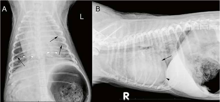 Thoracic radiographs of an 8-year-old intact male Chihuahua in two projections (A: ventrodorsal, B: left to right lateral projection). The images