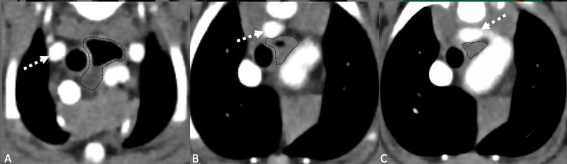 Postcontrast transverse CT images in a soft tissue window (WW 400, WL 40) showing a representative example of esophageal dilation (A) and compression (B, C) in a patient with an aberrant right subclavian artery (ARSA, depicted with the dashed arrow). Left is to the right of the image. (A) Cranial to the heart base the esophagus (encircled by the dashed black line) is dilated with gas dorsally, and fluid attenuating content ventrally. (B, C) As the ARSA passes dorsally, the esophageal diameter is markedly reduced compared with image (A). This patient had clinical signs attributable to the ARSA.