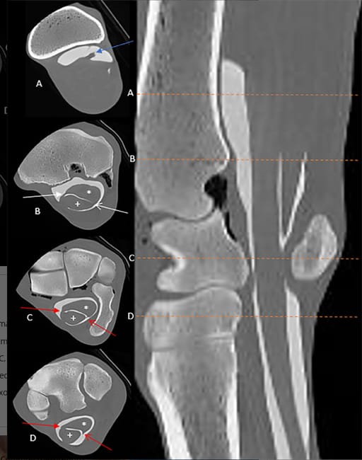 Transverse and sagittal contrast CT images in bone window showing the radial head of the deep digital flexor tendon (A; blue arrow), the proximal mesotenon (B; white arrows, shaded arrowhead is medial) and the manica of the common mesotenon (C, D; red arrows, shaded arrowhead is medial, site of attachment to the common mesotenon). N.B. The dashed orange lines correspond to the transverse sections on the left (images A–D); * is the deep digital flexor tendon, + is the superficial digital flexor tendon.