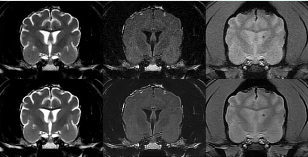 Transverse T2W (left), T2-FLAIR (middle), and GRE (right) brain MRI images in a 13-year-old standard poodle. Native images are at the top, and corresponding AI-treated images are at the bottom. For this patient, the increase in SNR on AI-treated images ranged between 77% and 109% for the T2W images, 24.6% and 37.3% for the T2-FLAIR images, and 61.9% and 84.7% for the GRE images. This patient received higher (i.e., better) coarseness, contrast, and overall quality scores for the AI-treated images than the native images. A left-sided microbleed is visible on the GRE images. Slice thickness = 3 mm, interslice gap = 0.5 mm, FOV = 14 cm; T2W image parameters: TR = 3665 ms, TE = 100 ms, NEX = 3; T2-FLAIR image parameters: TR = 8962 ms, TE = 146 ms, TI = 2376 ms, NEX = 2; GRE image parameters: TR = 717 ms, TE = 15 ms, Flip angle = 20°, NEX = 2.