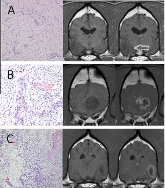 Canine intracranial gliomas: grade II (A – astroctyoma), grade III (B – olidodendroglioma) and grade IV (C – glioblastoma). From left to right: Hematoxylin and eosin stained photomicrographs, T1W and T1W post-contrast transverse magnetic resonance images. The grade II astrocytoma is non-enhancing and superficially located (arrow). Histopathologically, it displays no microvascular proliferation or necrosis. The grade III oligodendroglioma is in a deeper location, contains multiple intra-tumoral fluid accumulations, and is severely enhancing in a ring-like pattern. Histopathologically, it is intermediate, displaying microvascular proliferation. The glioblastoma displays severe ring enhancement and a single cyst. Histopathologically, necrosis and cavitation, microvascular proliferation and profound pleomorphism are present