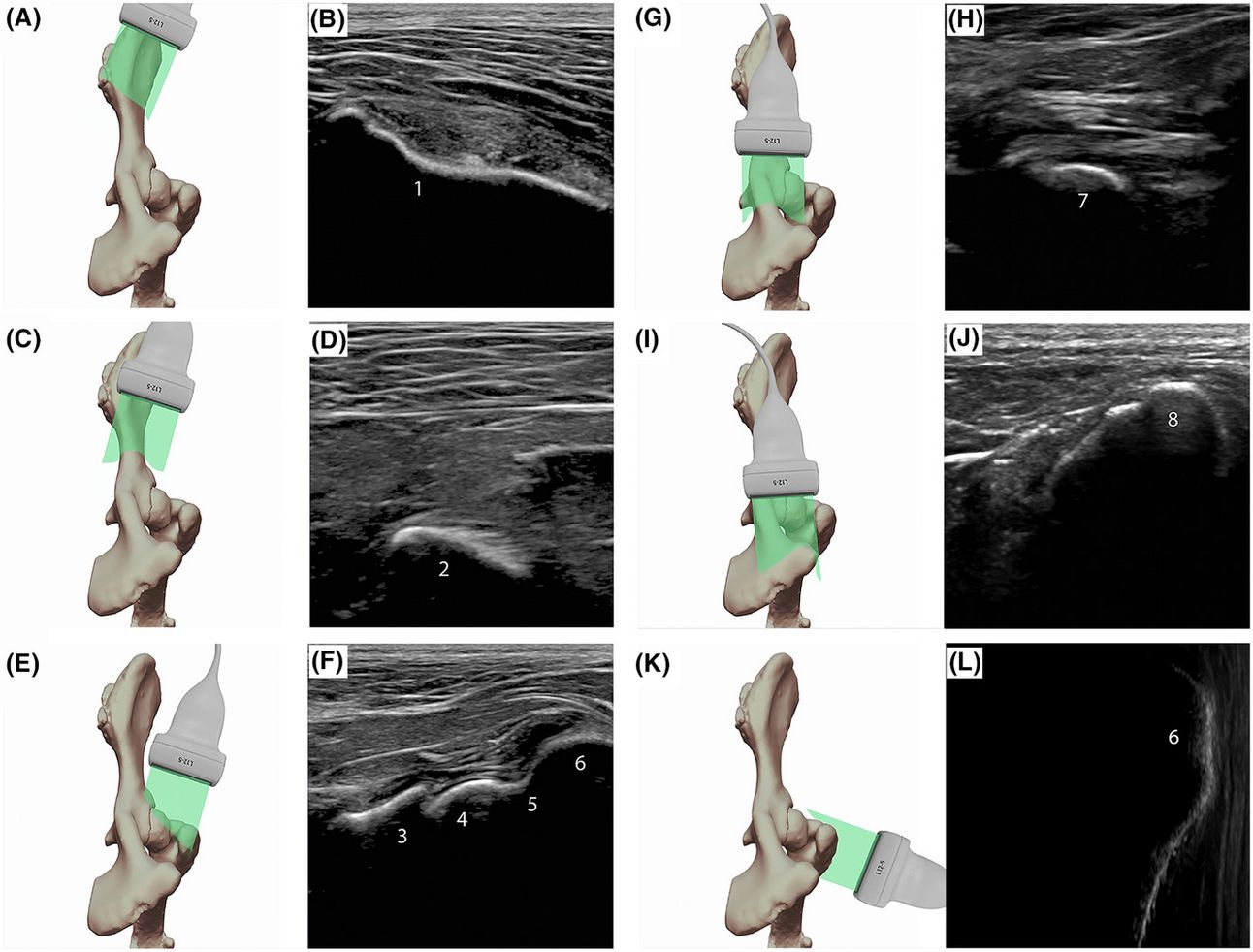 A-E. Graphic illustration of probe placement and corresponding ultrasound images of a normal hip (medial-lateral probe orientation): A and B, cranial aspect (wing) of ilium (1); C and D, caudal aspect (body) of ilium (2); E and F, acetabulum (3) with femoral head (4), femoral neck (5), and greater trochanter (6); G and H, ischium (7); I and J, tuber ischium (8); K and L, distal-proximal probe orientation on the lateral aspect of the greater trochanter