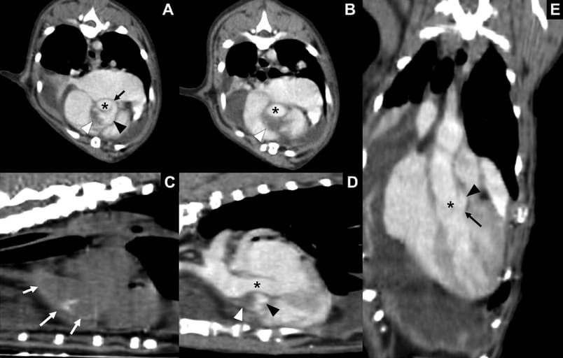 An 11-year-old male neutered cat presented with dyspnea and was diagnosed with cardiomegaly and pulmonary edema. Echocardiography revealed features of AD, aortic insufficiency, left ventricular hypertrophy, and left atrial enlargement. Serial follow-ups included radiographs, thoracocentesis, and a CT scan three months post-diagnosis to evaluate progression. Post-mortem gross and histopathological examinations were conducted following the cat's sudden death ten weeks after the CT.
