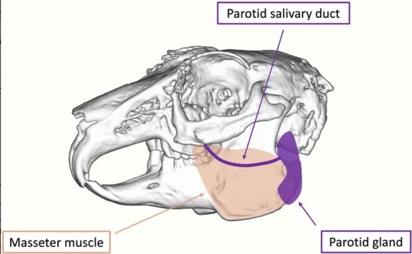 Anatomical diagram of the parotid salivary gland and duct in rabbits.