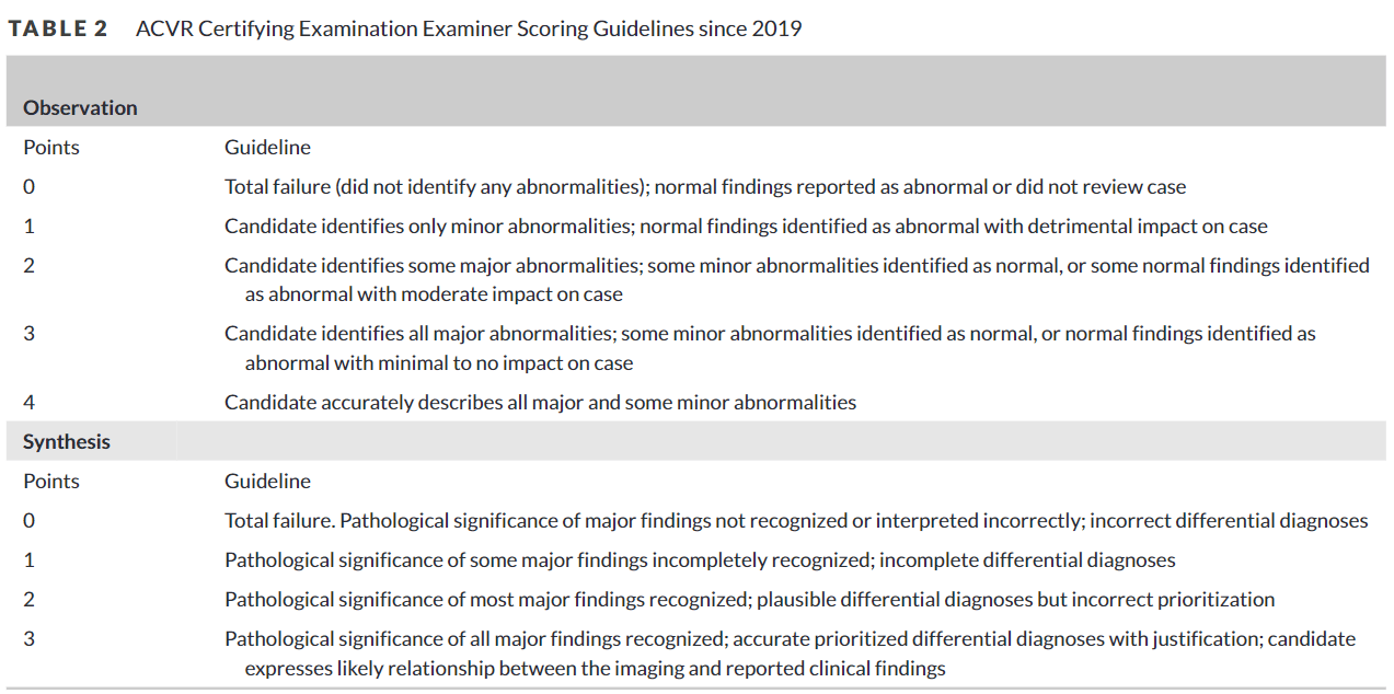 The Examiner Scoring Guidelines for the ACVR Certifying Examination primarily reward correct identification of major findings.