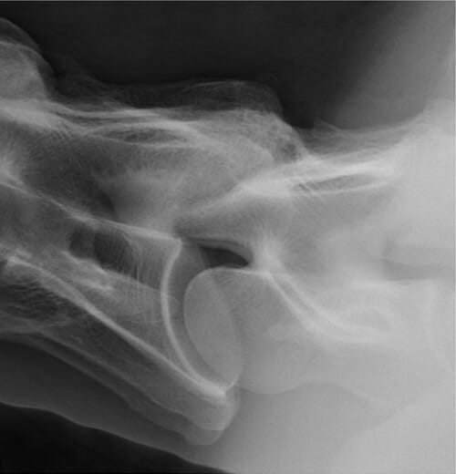 Lateral radiographic image of C6-C7 in which half of the observers considered this image to be consistent with moderate to severe (grade 3) CAPJ OA and half of the observers considered this image to be consistent with mild (grade 2) CAPJ OA. Acquired with 90 kVp, 40 mAs, using a 10:1 grid (Canon, Version 2.16.0.31, Canon, Glen Mills, PA).