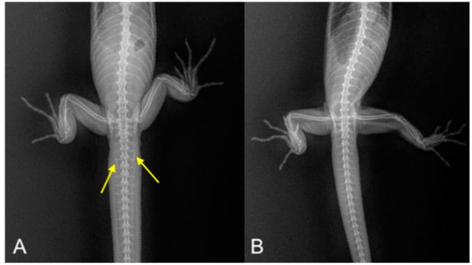 On the left (A), radiograph of a mature male black-headed monitor (Varanus tristis), showing evident mineralized hemibacula (yellow arrows). On the right (B), a mature female of the same species; hemibacula are absent. Courtesy of Dr. Clément Paillusseau.
