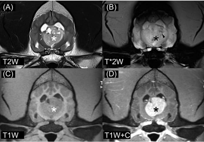 MRI of ependymoma in a 5-year-old Rottweiler (field strength = 3 tesla). There is a contrast-enhancing mass involving the third ventricle and thalamus (*). A, The white arrowhead denotes a small area of intralesional fluid accumulation. The small white arrows denote the T2W hyperintensity of the adjacent brain (presumed vasogenic edema). The small black arrow denotes the third ventricle, which is displaced and abnormally shaped. B, The black arrowhead denotes a small region of reduced signal intensity, thought to represent intralesional hemorrhage. B, There is a susceptibility artifact involving the dorsal aspect of the brain. This is attributed to the close proximity of the air-filled frontal sinuses. T2W, T2-weighted image; T2*W, T2*-weighted image; T1W, T1-weighted image; T1W+C, T1-weighted image made after gadolinium-based contrast medium administration.