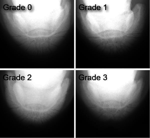Radiographic images of the P3 showing notches close to the average measurements for each grade. The width (W) and the depth (D) of the notch in each grade shown here are as follows. Grade 0, W 10.7 mm, D 1.2 mm. Grade 1, W 11.7 mm, D 1.9 mm. Grade 2, W 15.1 mm, D 3.7 mm. Grade 3, W 15.8 mm, D 6.2 mm.
