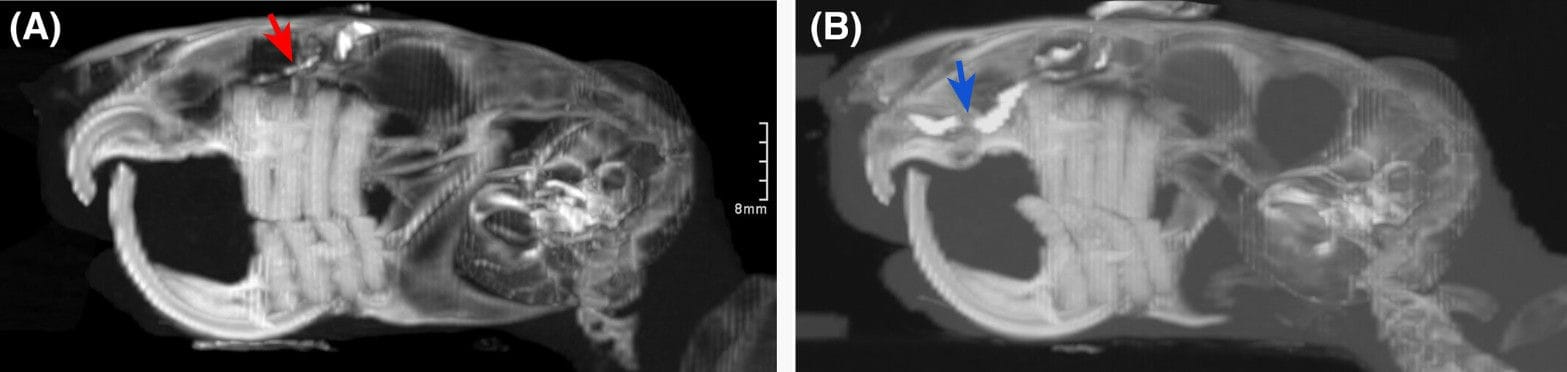 Contrast dacryocystorhinography of Chinchilla 2. The nasolacrimal punctum of the right eye could not be cannulated for contrast infusion (A). However, a small amount of contrast can be seen in the proximal duct (red arrow). Periapical abscessation of the retained left maxillary incisor extended into the nasal cavity and was associated with focal narrowing of the nasolacrimal duct (B), evident by the attenuation of the contrast column at this point (blue arrow) along with dilation of the nasolacrimal duct proximal to this point.