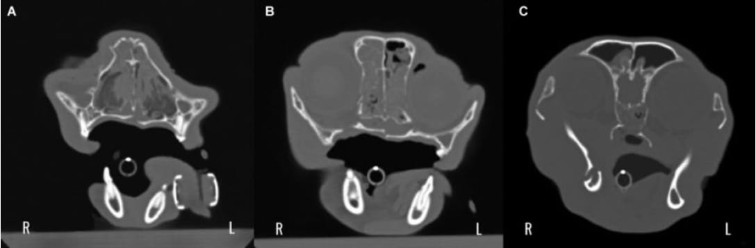 (A–C) Typical multifocal fracture pattern impacting the respiratory, olfactory and digestive system combined with orbital lesions and