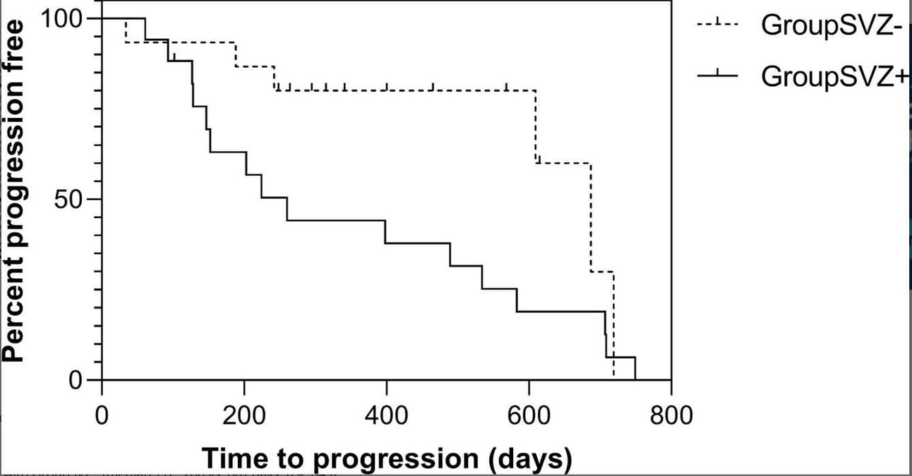 -SVZ+ tumors had a higher progression rate (94.1% vs. 40%) and CNS metastasis (52.9% vs. 13.3%)