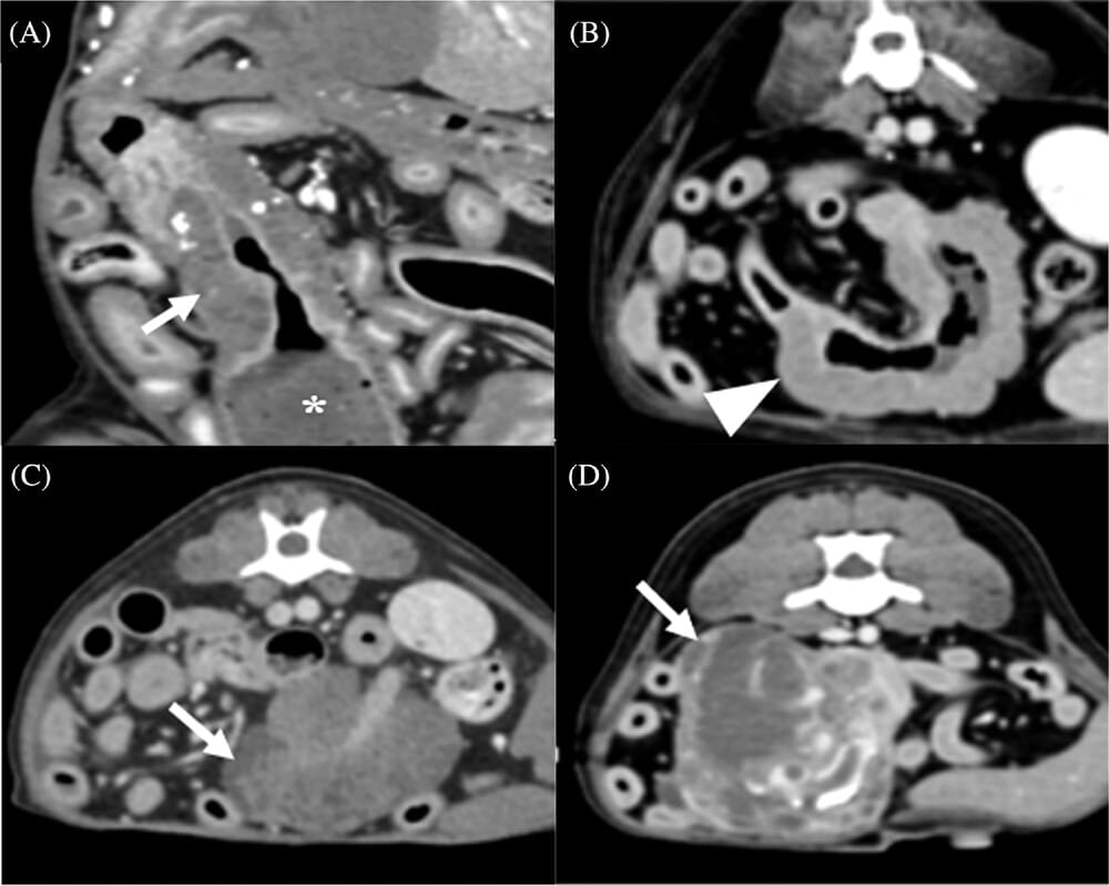 Postcontrast dorsal planar (A) and transverse (B–D) CT images representing the type of tumor growth in small intestinal tumors. A, Endophytic growth with tumoral changes toward the lumen of the small intestine (arrow) and with small intestinal dilation (asterisks). B, Exophytic growth with tumoral changes toward the outer wall of the small intestine (arrow). C,D, Lobulated growth without intestinal morphology (arrows)