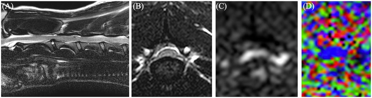 Example of MRI (A, B), diffusion tensor imaging (DTI, C), and fractional anisotropy (D). A, T2-weighted sagittal image of a C2-3 intervertebral disc herniation. The asterisk indicates where transverse images (B–D) were taken. B, T2-weighted transverse at C2-3. C, Registered DTI at the level of C2-3. D, Colored FA map at the level of C2-3 with the spinal cord indicated in blue