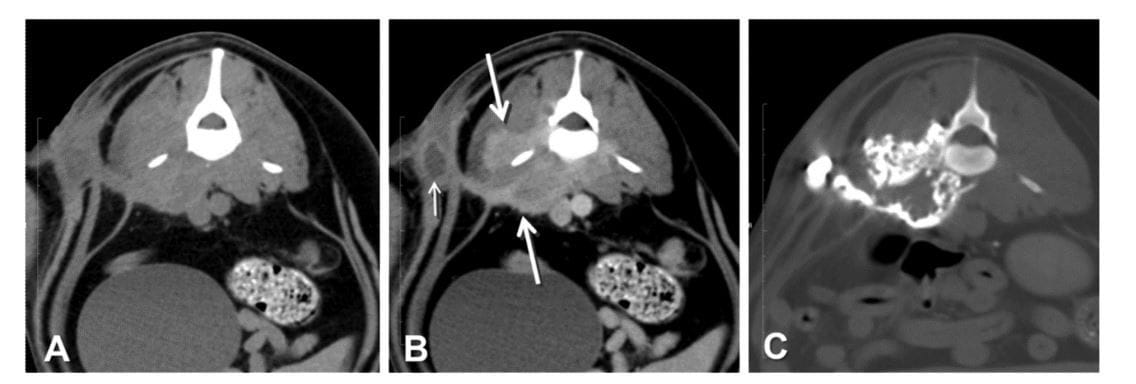 (A) Transverse pre-contrast image. (B) Transverse post-IV contrast image showing a cavitary lesion (small arrow), and swelling and heterogeneous