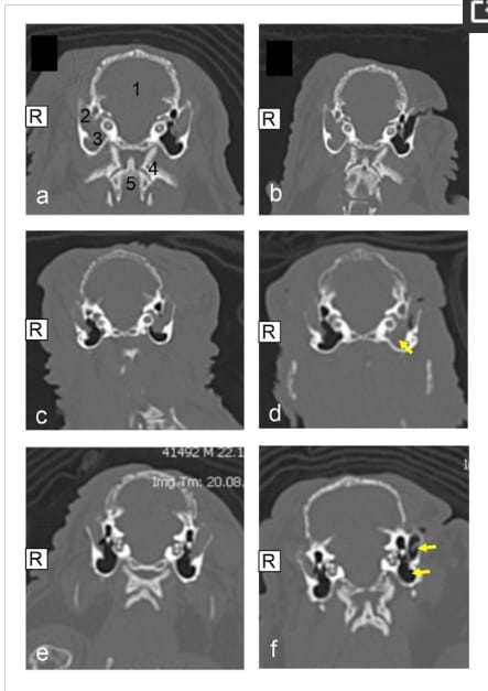 Computed tomographic (CT) image (native, transversal plane, bone window) (a–f): veterinary clinic Posthausen, Germany); (a,b): pet rabbit no. 14, (a): prior to lateral ear canal ablation (LECA) surgery on the left ear, (1) cranium, (2) external ear canal, (3) middle ear, (4) first cervical vertebra, and (5) second cervical vertebra; (b): 365 days after LECA surgery on the left ear, improved ear status, external ear nearly completely filled with air; (c,d): pet rabbit no. 19, (c): prior to LECA surgery on the left ear, (d): 240 days after LECA surgery, complete soft tissue filling of the middle ear; (e,f): pet rabbit no. 20, (e): prior to LECA surgery on the left ear, (f): 365 days after LECA surgery, improved ear status, external ear nearly completely filled with air.