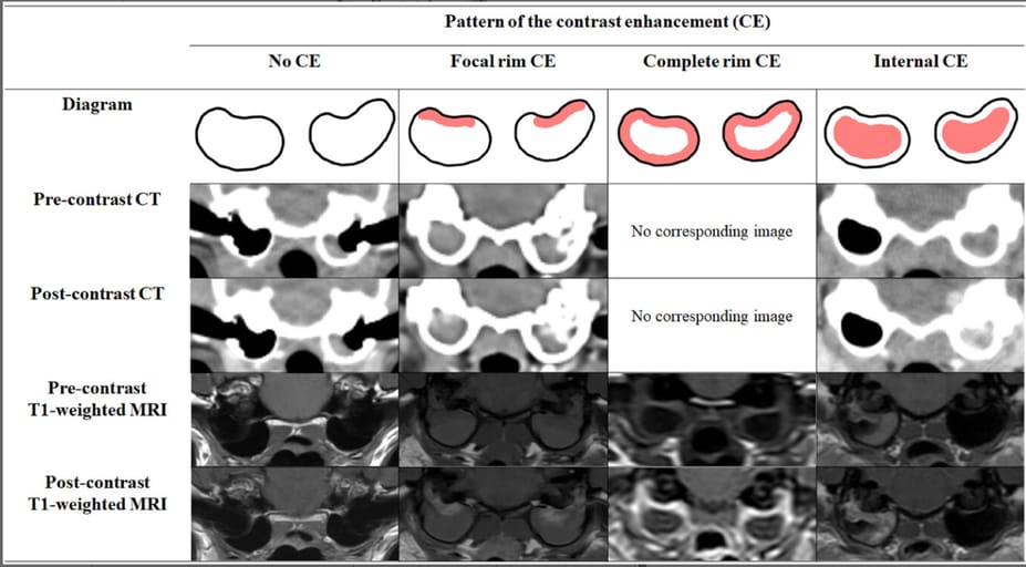 Schematic diagrams and representative CT and MRI images of different contrast enhancement patterns of the tympanic bulla. The images show no contrast enhancement, focal dorsal enhancement, complete rim enhancement, or heterogeneous internal enhancement. Each CT and MRI image represents a different cat.