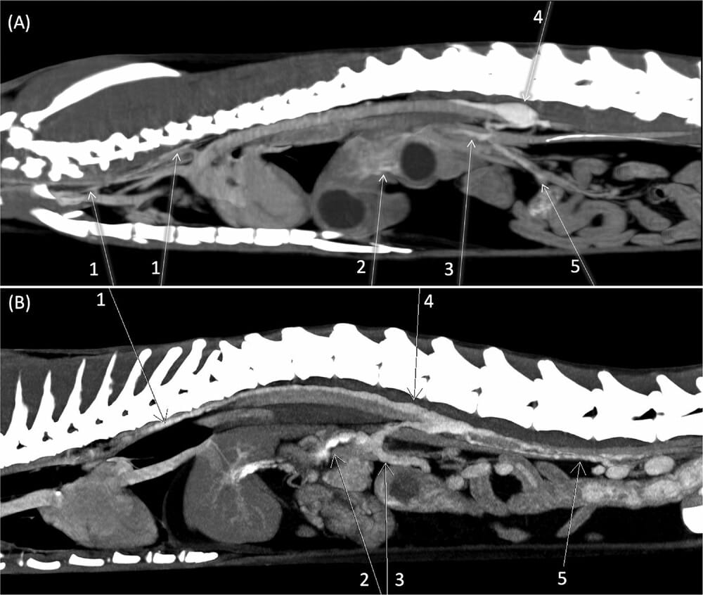 Sagittal reconstruction from delayed post-contrast intravenous series showing diffuse enhancement of the lymphatic system in two feline patients (A, B). A, Images acquired with 16-row MDCT unit (Siemens Emotion 16) (Slice thickness 1,5 mm; WW 402; WL 109). 1- thoracic duct; 2- hepatic lymph vessels; 3- celiac trunk; 4- cisterna chyli; 5- mesenteric lymph vessels. B, Images acquired with Dual-source CT 192 × 2 (Siemens Somatom Force) volume rendered (Slice thickness 0,6 mm; WW 300; WL 40). 1- thoracic duct; 2- celiac trunk; 3- mesenteric trunk; 4- cisterna chyli; 5- lumbar trunks.