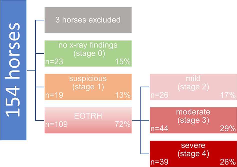 Flow chart of study population. Number of horses with and without Equine Odontoclastic Tooth Resorption and Hypercementosis (EOTRH) and its severity. The findings of 3 horses (P095, P143, and P147) had to be excluded due to lack of x-rays.