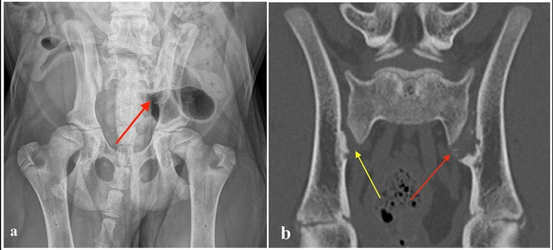 (a) Ventrodorsal radiograph of a four-month-old Bernese Mountain Dog with erosive lesions in the left sacroiliac joint (red arrow). (b) Computed tomography image (coronal plane) of the same dog, showing multiple small, randomly distributed cystoid and irregularly shaped concave defects within the left sacroiliac joint surface with deep peripheral sclerosis (left side red arrow). Similar but milder defects are visible on the right side (yellow arrow).