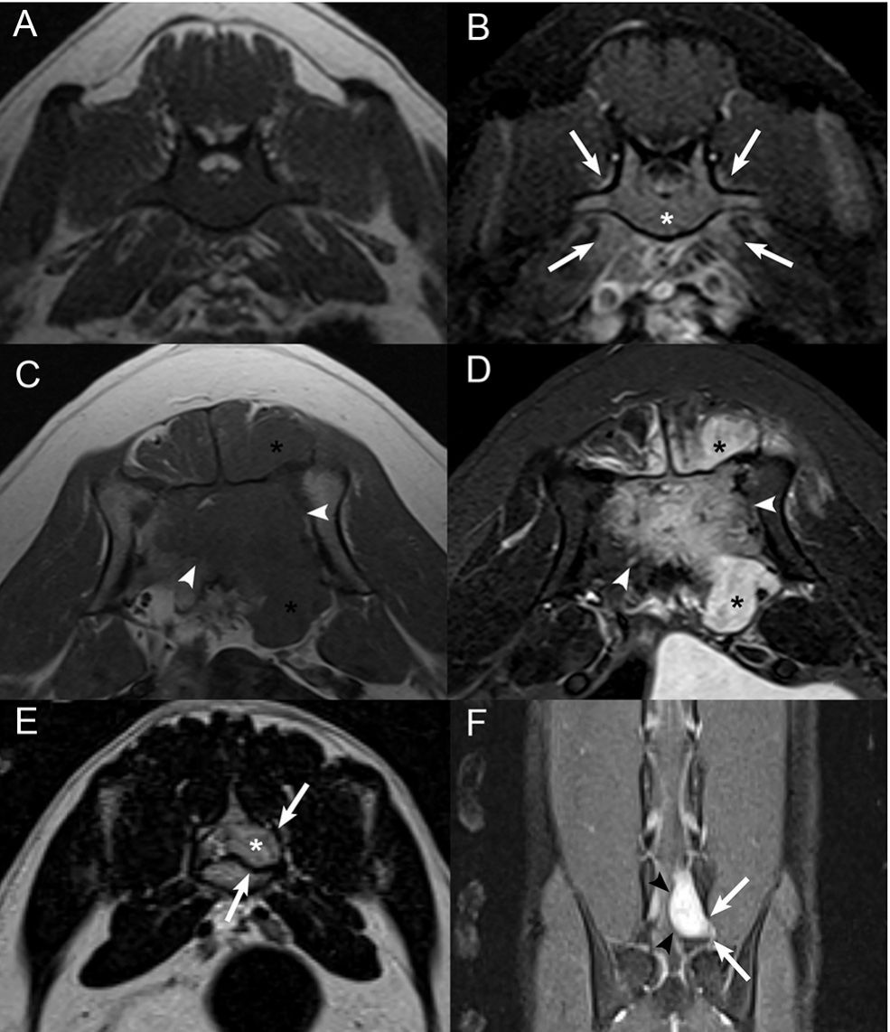 (*). (E) Transverse T2W image and (F) dorsal post-contrast T1W image with fat