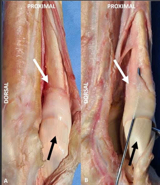 Dissected images of a forelimb (A) and hindlimb (B) manica flexoria (white arrow), with the flexor tendons reflected, depicting the dorsal margin of the deep digital flexor tendon and the adjacent manica flexoria. The deep digital flexor tendon is seen passing through this structure (black arrow). Note the convex proximal margin and the angled medial and lateral distal margins of the manica flexoria. In the hindlimb, note that the proximal margin of the manica flexoria is ill-defined and blends into the fascia overlying the deep digital flexor tendon.