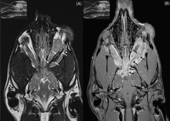 High-resolution images focused on the optic nerve with insets showing the exact imaging plane. (A) T2-weighted dorsal plane image optimized for the optic nerve. Small white arrows outline the retrobulbar portion of the mass encasing the optic nerve, which displays a focal, ill-defined hypointense thickening mid-aspect. (B) T1-weighted post-contrast dorsal plane image optimized for the optic nerve, acquired at a level just dorsal to (A). Small black arrows trace the enhancing retrobulbar portion of the optic nerve sheath complex extending towards the optic chiasm.