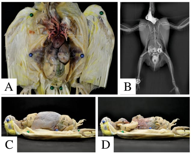 Cockatiel dissection photographs (A, C, D) and radiography images (B). Cervical (1) and celomic oesophagus (3) as long, narrow tubes and its sacciform dilation, the ingluvies (2). The glandular (4) and muscular (5) stomachs, elongated and globose, respectively, to the left of the median plane. The intestine with a U-shaped duodenum (6), colon (7) and cloaca (8) can be seen coiled in the caudal part of the celomic cavity. Additional structures were identified for providing topographic references for anatomical studies: Trachea (9), heart (10), liver (11), pancreas (12) and keel of the sternum (13). Scale: 1 cm.
