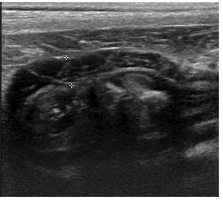 Sagittal ultrasonographic image of the stomach of a dog from the prospective study. The unorganized hyperechoic striations (UHS) are seen in the gastric muscularis layer (between the asterisks). This dog had no clinical sign related to the gastrointestinal tract