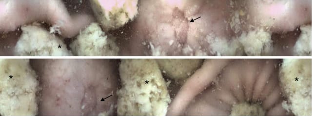 Capsule endoscopy image obtained in the stomach of dog 10 one month following percutaneous transvenous coil embolization (PTCE). A resolving ulcer (grade 6 mucosal lesion; black arrows) is observed in the gastric wall. Note the gastric fluid and concurrent ingesta (asterisks) obscuring some of the gastric wall.