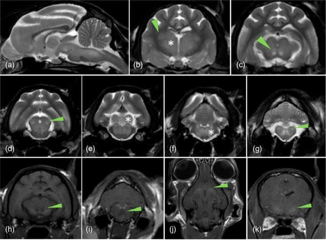 Magnetic resonance imaging of a cat with hepatic encephalopathy due to congenital extrahepatic portosystemic shunts revealed bilateral symmetrical T2-weighted (T2W) hyperintense and T1-weighted (T1W) hypointense non-contrast-enhancing lesions in the thalamus, lateral geniculate nuclei, red nuclei, caudal colliculi, vestibular nuclei, olivary nuclei and dentate nuclei, and T1W hyperintensity in the lentiform nuclei. (a) Sagittal T2W sequence showing diffuse T2W hyperintensity in the brainstem. Transverse T2W sequences showing bilateral symmetric T2W hyperintensities in the (b) thalami (asterisk) and lateral geniculate nuclei (arrowhead), (c) red nuclei (arrowhead), (d) rostral colliculi (arrowhead), (e) caudal colliculi (asterisk) and reticular formation, (f) white matter (asterisk) and (g) vestibular nuclei (arrowhead). Transverse (h and i), dorsal (j) and transverse (k) T1W precontrast sequences showing T1W bilateral hypointensity of the red nuclei (arrowhead; h), white matter (arrowhead; i) and T1W hyperintensity of the lentiform nuclei (arrowhead; k and l).