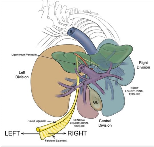 Illustration of canine liver anatomy, caudoventral aspect (viewed from the umbilicus). The liver includes right (blue), left (orange), caudate (green), and quadrate (red) lobes. Notice that some structures are in fissures and outside the lobes, including most of the portal vein. The location of the porta hepatis is marked by hepatic artery (1), bile duct (2), and portal vein (3). The portal vein splits into right (4) and left portal branches. The left portal branch is divided into transverse (5a) and umbilical (5b) parts by the round/falciform ligaments and ligamentum venosum. These ligaments connect the umbilicus to the left portal branch, and from the left portal branch, the ligamentum venosum continues dorsally, passing between the left lateral liver lobe and papillary process, and then right cranially to join the caudal vena cava (6) at the confluence of the left, middle, and papillary hepatic veins. In some dogs, the falciform ligament continues cranially to the diaphragm. Source, ©Lauren D. Sawchyn, DVM, CMI. [Colour figure can be viewed at wileyonlinelibrary.com]