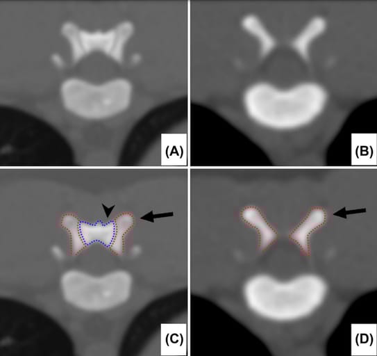 Transverse computed tomography images at the level of the T11/12 facet joint showing the difference between an anatomically correct facet joint (A and C), consisting of normally developed cranial (arrow, red outline) and caudal (arrowhead, blue outline) articular processes, and a case of bilateral caudal articular process aplasia (B and D)