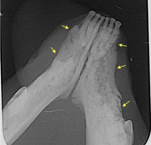 Case 7: Dental radiograph showing ill-defined, irregular shaped, low-dense radiopaque areas located at the most superficial aspect of the affected bone with irregular alveolar bone margins (yellow arrows).