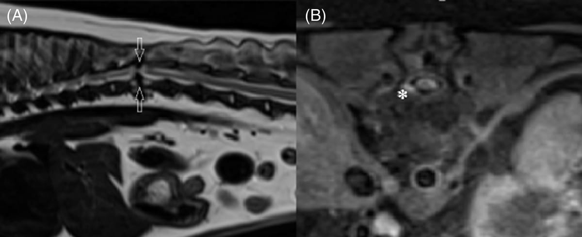 (A) Sagittal T2-weighted magnetic resonance (MR) image of the thoracolumbar region displaying a hypointense ventral and dorsal spinal cord compression and focal spinal cord atrophy at the level of T12-T13 indicated by the arrows. (B) Transverse T1-weighted fat saturated postcontrast MR image of the same dog at level of T12 displaying a hypointense band of tissue predominantly dorsolateral to the spinal cord. There is contrast enhancement of the ventrolateral meninges and spinal cord atrophy at this location indicated by the asterisk.