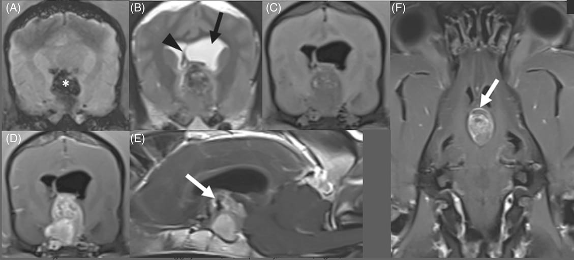 Magnetic resonance imaging of pituitary apoplexy in the same dog. (A) Transverse susceptibility-weighted imaging (SWI) reveals a large suprasellar blooming artifact (marked with white asterisk). (B) Transverse T2-weighted (T2W) image revealing an ovoid suprasellar mass which is heterogeneously T2 hypointense with internal T2 hyperintense foci relative to surrounding gray matter. Obstructive hydrocephalus of the left lateral ventricle is marked with the black arrow, with deviation of the septum pellucidum (black arrowhead), consistent with a falcine shift. (C) Transverse T1-weighted (T1W) image heterogeneously T1 hypointense with internal T1 hyperintense foci relative to surrounding gray matter. (D-F) Respectively, transverse, sagittal, and dorsal T1W images after contrast administration, showing strong contrast-enhancement with some areas of ring-enhancement (white arrows). There is flattening of the rostral cerebellum and compression of the rostral colliculi, consistent with transtentorial herniation.