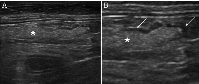 Longitudinal sonogram of jejunal lymph node lipomatosis obtained prior to euthanasia. The central hyperechoic area (stars) corresponds to the lipomatous tissue. In panel B, the image was magnified to optimize the visibility of the peripheral rim (arrows).