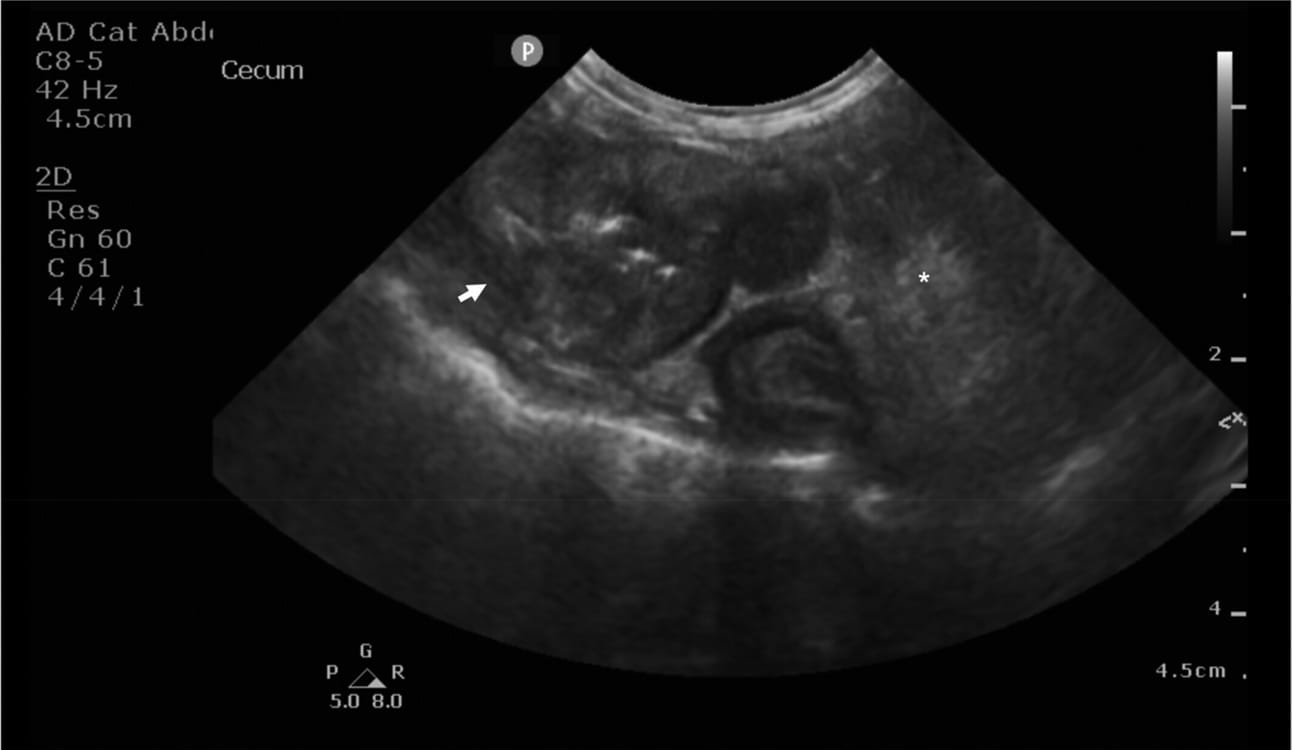 Ultrasonographic image of a mass at the level of the ileocolic junction (white arrow). The mass shows loss of layering, circumferential thickening and eccentric growth. The wall is heterogeneously mixed in echogenicity because of hyperechoic areas. The surrounding peritoneum is hyperechoic (asterisk).
