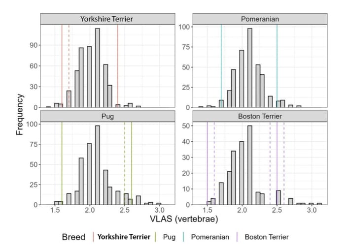 Vertebral heart size (VHS) is a widely used method for assessing cardiac size in dogs, but breed-specific reference intervals are necessary due to anatomical variations among breeds. Previously published VHS reference values for some breeds were based on small sample sizes, limiting their reliability. This study aimed to establish updated breed-specific VHS and vertebral left atrial size (VLAS) reference intervals for Yorkshire Terriers (YTs), Pomeranians (POMs), Pugs, and Boston Terriers (BTs) using a large dataset.