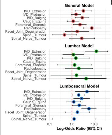 Forest plots showing log-odds ratios (95% confidence intervals) for MRI-diagnosed pathologies associated with pain across three models. The general model evaluates the associations with overall pain, the lumbar model examines lumbar pathologies and their association with lumbar pain (excluding lumbosacral pathology), and the lumbosacral model evaluates lumbosacral pathologies and their association with lumbosacral pain (excluding lumbar pathology).
