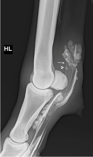 Lateromedial contrast radiograph demonstrating two diagnostic criteria used for assessment of manica flexoria lesions. The two parallel lines which delineate the manica flexoria just above the proximal sesamoid bones, at the dorsal border of the deep digital flexor tendon, are not visible (arrow), and there is an isolated area of contrast overlying the dorsal border of the deep digital flexor tendon at the level of the manica flexoria (arrowhead).