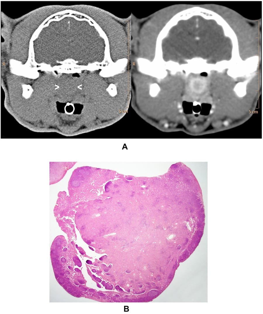 Example of an inflamed nasopharyngeal polyp in a 14-year-old domestic short haired cat. (A) The polyp (arrowheads) has moderate attenuation (40 HU) in precontrast CT image (at left) and is difficult to distinguish from the surrounding tissues. In postcontrast CT image (at right), the polyp has a relatively marked increase in attenuation of the core (120 HU) and rim (191 HU). The rim appears complete in this image. A slight amount of noncontrast-enhancing material, probably exudate, separates the polyp from adjacent nasopharyngeal mucosa. (B) Corresponding histologic section of the polyp (maximal diameter 10 mm), which was graded as having moderate edema and inflammatory infiltrate in the core stroma and marked inflammatory infiltrate in the peripheral stroma (note deep staining; H&E stain).