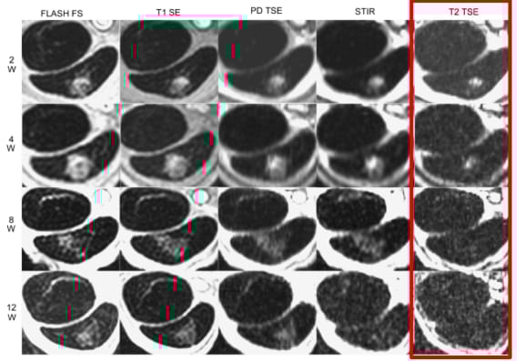 12 weeks. The red box outlines the T2 fast spin echo (FSE) sequence which shows that T2