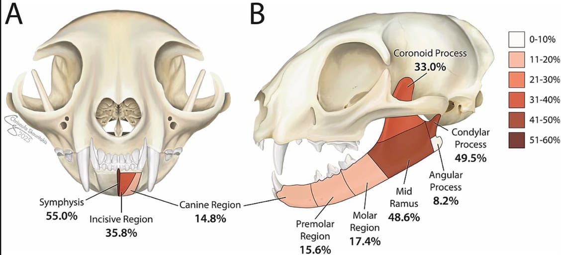 Summary of prevalence of injured regions of the mandible in the cohort of cats. Each percentage represents the percentage of cats that exhibited a fracture in each respective region affecting the left or right mandible or both mandibles. Coloration of each segment indicates frequency of injury with darker colors denoting more commonly injured regions. ‘Symphysis’ d