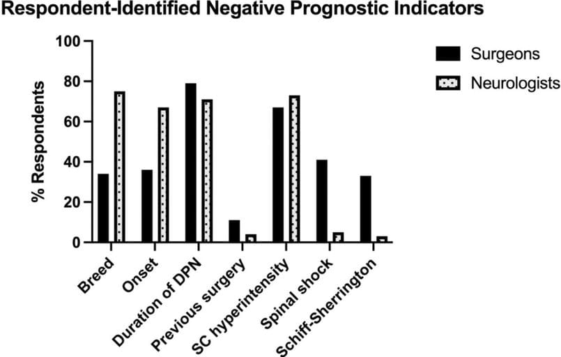 Factors considered negative prognostic indicators for recovery by “surgeons” and “neurologists” surveyed about their management approaches to acute canine thoracolumbar disc extrusion. “Surgeon” includes respondents indicating ACVS or ECVS board certification and “neurologist” includes respondents indicating ACVIM (neurology) or ECVN board certification.