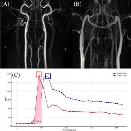 Dorsal images from low-flow–high-volume protocol using time-resolved imaging of contrast kinetics with maximum intensity projection reconstruction. (A) Phase 11 and (B) Phase 15. A red circular region of interest (ROI) for signal intensity was placed at the center of the right common carotid artery in (A), and a blue ROI of identical size was placed at the center of the right external jugular vein in (B). To measure the standard deviation of background noise, identical circular ROIs (white circles) were placed in the air regions on both the left and right sides in (A). A rectangular ROI (yellow rectangle) was also placed at the same level to measure the coefficient of variation. (C) Time–intensity curves generated from circular ROIs placed within the artery and vein. The red and blue lines represent the arterial and venous signal-to-noise ratio (SNR) values, respectively. Colored squares indicate the peak SNR values for each vessel. The diagnostic imaging window for MRA (dwMRA), illustrated as a shaded light red area, corresponds to the area under the arterial SNR area under curve up to the point just before the venous SNR surpasses the arterial SNR.